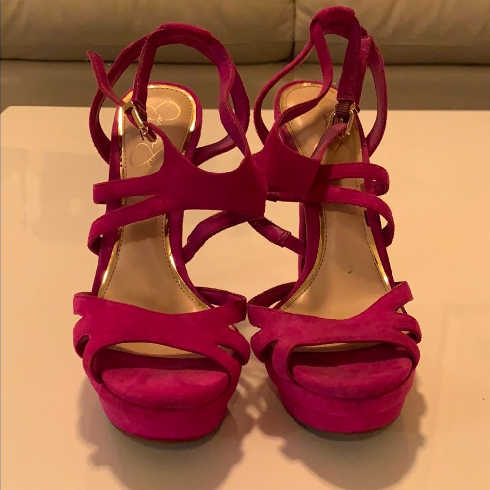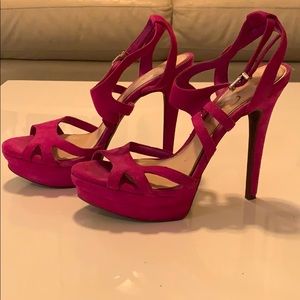 Suede magenta open toe heels