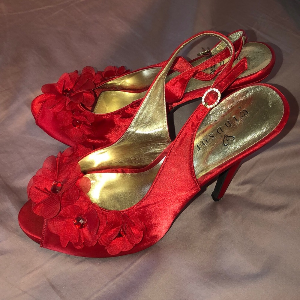 Bright red 3 inch Windsor heels. Only worn twice. Gold accent buckle. Red tulle flowers with red gem center pieces