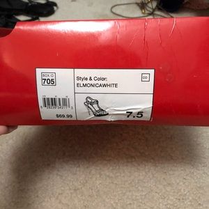 White and gold Elle heels!! Never wore them outside but they do have some flaws. Some kind of blue time on he bottom of one of the heels I guess from sitting in storage. Still have original box and everything