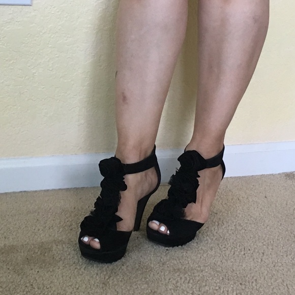 Barely used heels ! Size 6 1/2 all black with flowers in front