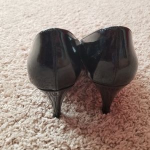 3" Black Open-Toe Pumps; Man-made materials; made in China. Slight scratches but otherwise in good condition.