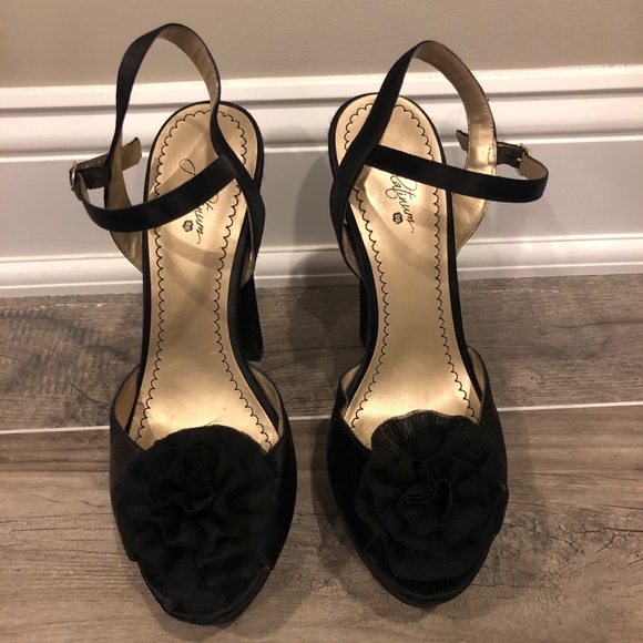 Black block heels with high platforms. Easy to walk in. Have a black rose in the front. Only worn a few times.