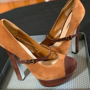 Brown & Burgundy, Closed Toe w/cross strap, Taupe Kid Suede, 5inch Platform Heels.