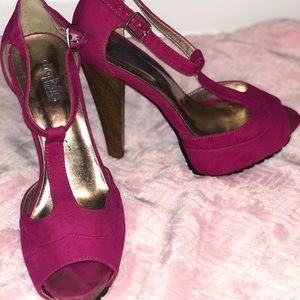 Hot pink with wooden heel; slightly used; worn a few times; decent condition; true to size
