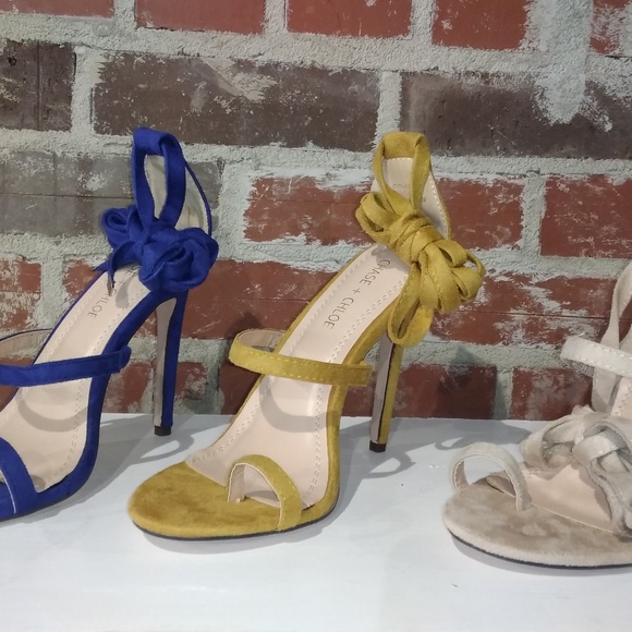 Wrap around heel that comes in royal, yellow and taupe. True to size.