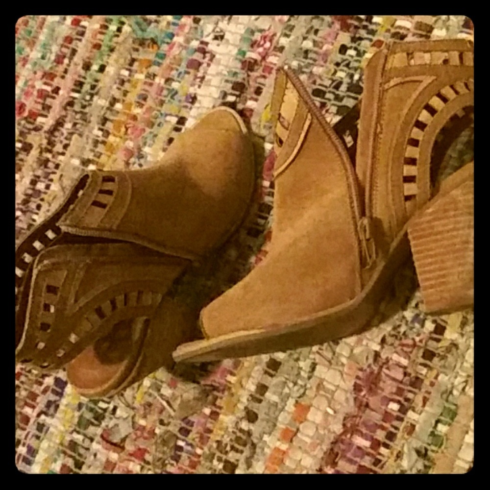 Size 8 brown suede open toe heels with pattern and zipper. Only worn a few times.