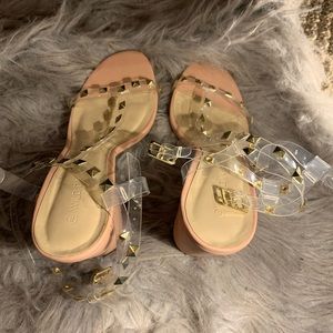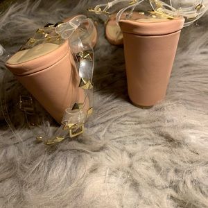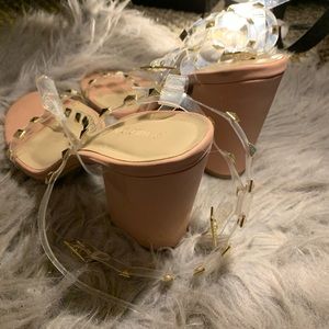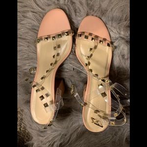 Light pink heels with gold squares throughout the clear straps. Haves 2 clips to secure straps around ankle. Worn once no damages , like new. size 8. Super cute in person !
