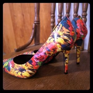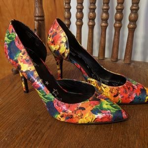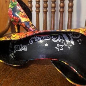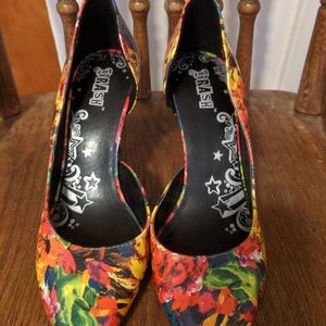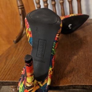 Beautiful, super colorful Brash heels for the heel lover in all of us! Not labeled as a wide but works great with a wide foot. Painted floral design and open inner-sides make these heels unique! Gotta have for any collector of heels!