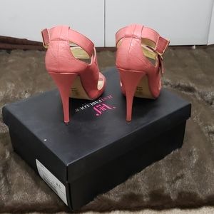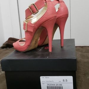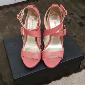 Coral heeled sandals by Justfab. Heel approx 4in. Still have lots of wear. Perfect for that summer Maxi dress