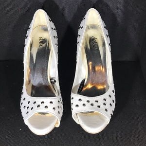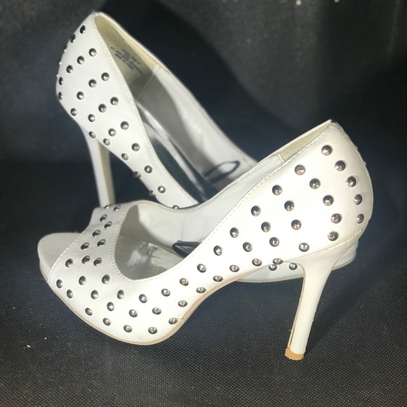 White patent leather with silver tone studs. Small platform in the front and stiletto heel.