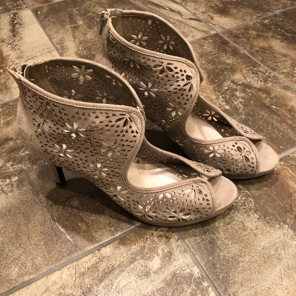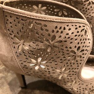 Beautifully designed cut outs make these shoes stand out! Beige suede open toed shoes will go with any outfit!!