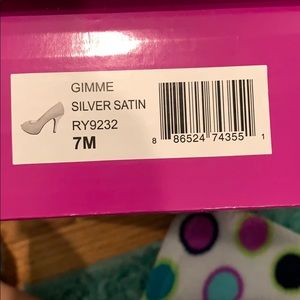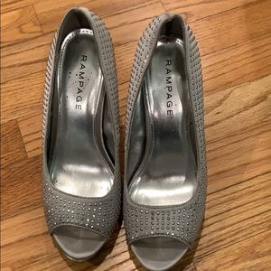 Silver heels with silver studs all over. Have an open toe and have no scuffs on them