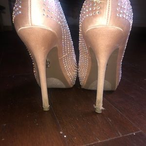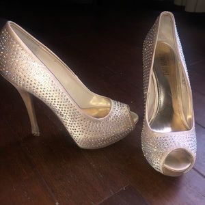 Super cute high heel shoes!! They do not say a size, but they fit me and I am size 8! They are silky gold with iridescent rhinestones! Have worn heels from my senior prom! Only worn a couple of times!