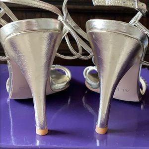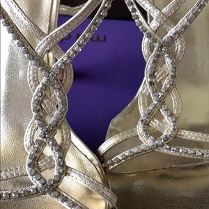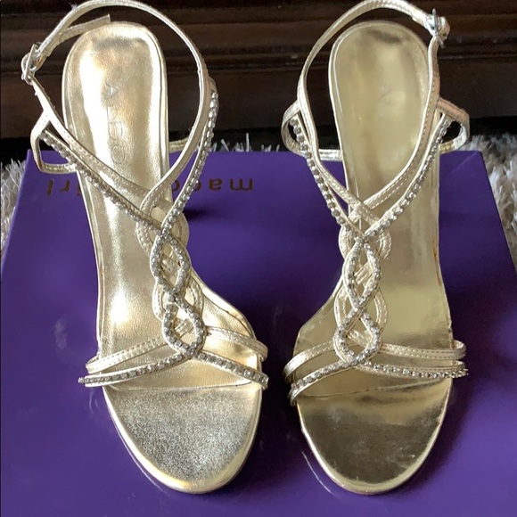 Gold heels with braided rhinestone detail. Adjustable ankle strap. Worn one time for a wedding.