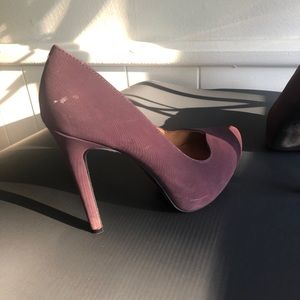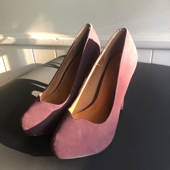 5.5in heels. A little scuffed all pictured. Right shoe: right side 2 inch long white, and then a smaller one near it maybe 3/4in. Left side near opening of shoe little scuff .5 inch. Left shoe right side: similar 1.5 in scuff. Barely noticeable when you’re wearing them but I wanted to be open