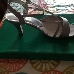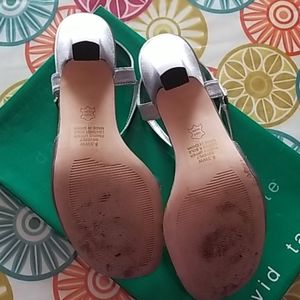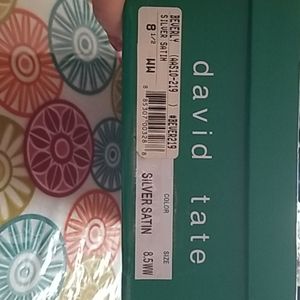 David Tate Women's BEVERLY Silver Dress Sandals Heel Height: Approx. 2 1/2'' Tall. Stunning evening shoe for special occasions or a night out on the town. Has a high quality satin upper with symmetrical strapping adorned by a rhinestone buckle and a leather outsole.