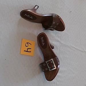 Brown wood slip on heel with a brown leather cross band in front with silver rhinestone buckle rubber bottom excellent condition like new kept in its original box