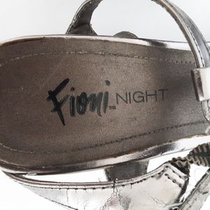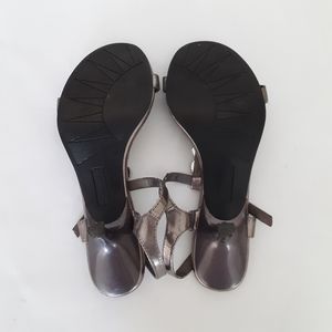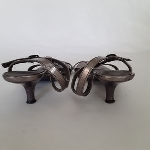 Silver, with silver hems that line the top of your feet, straps around the ankle, 2 inch heels. Very stable heels.