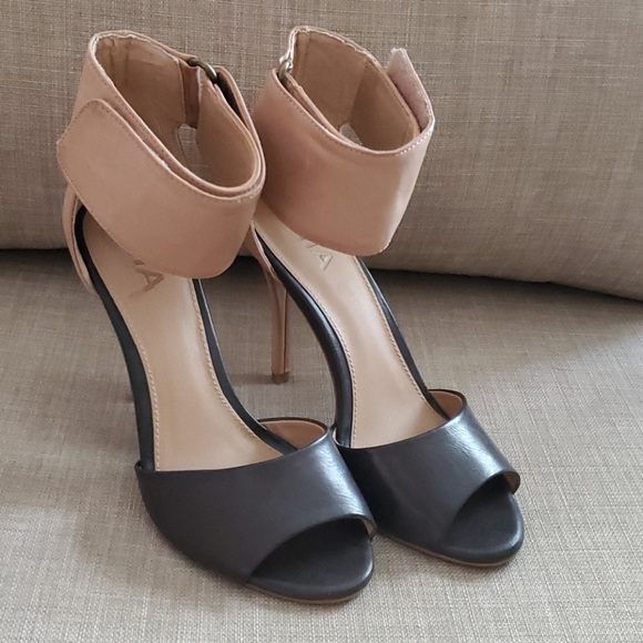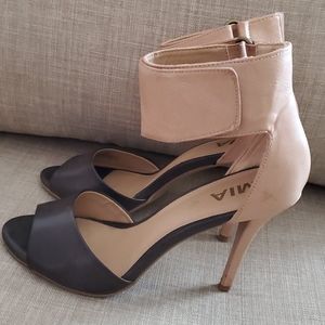 MIA genuine leather sexy ankle strapped heels. Brown and tan with adjustable velcro 2 inch wide strap. Worn only once.