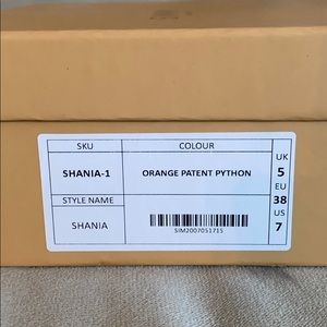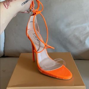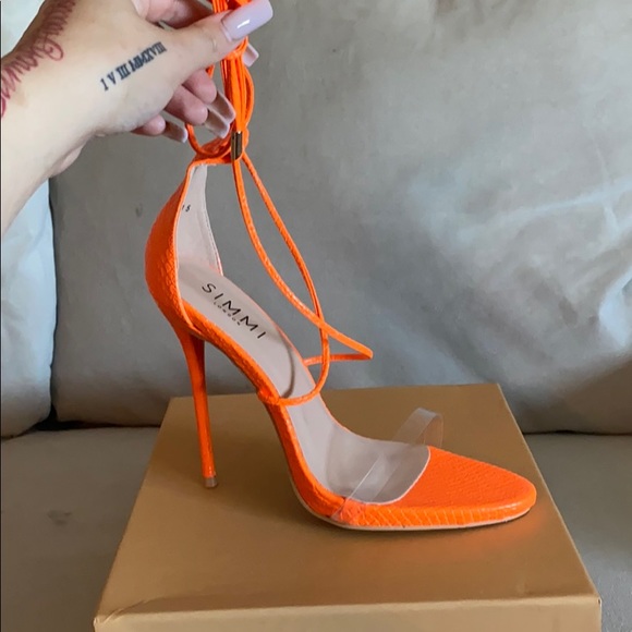 Orange tie up heels with clear strap. Very comfy. My favorite brand of heels. It says US 7 on the box but it fits like a true 8(EU 38)