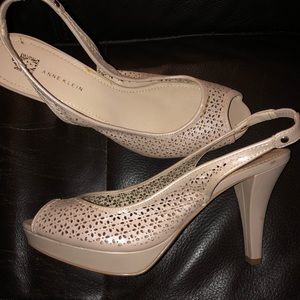 These are Anne Klein brand peep toe heels, size 9. They are a beige color and have a back strap. Only been worn twice but have a couple of minor flaws which is reflected in the price.