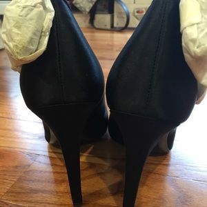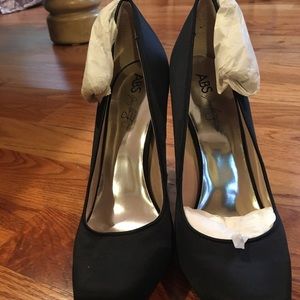 Brand new never worn ABS black satin heels with beautiful Rhinestone bow detail on the side