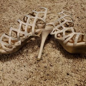 Nude 2-3 inch heels with rainbow effect sequins.