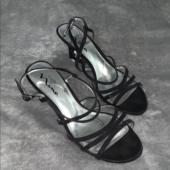 Simple black heels with black jewels on straps. Two-inch heel, lightly worn.