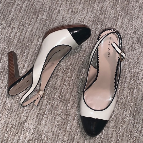 Black patent leather toe and cream sling back