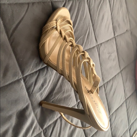Beige sandals with gold stones. Ankle wrapped straps. 2.5 inch heel