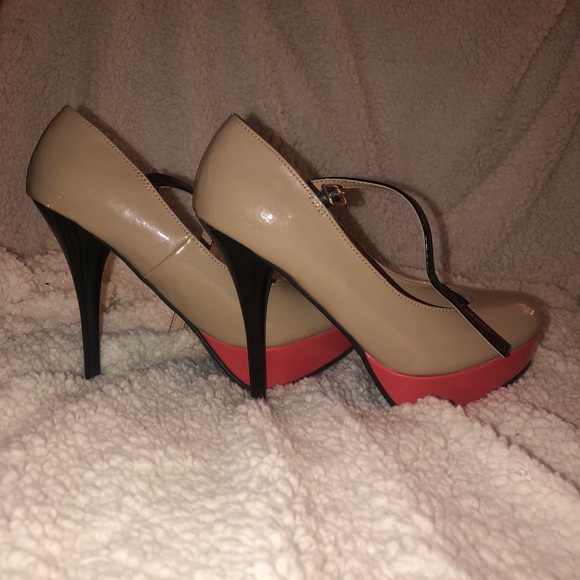 Nude and coral colors with a black strap around the ankle.
