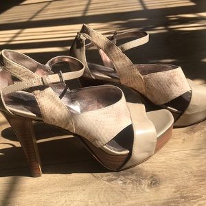 Very comfy heels! Worn a few times. Cream color with snake skin design. Size 7 1/2. Very minor defects pictured.