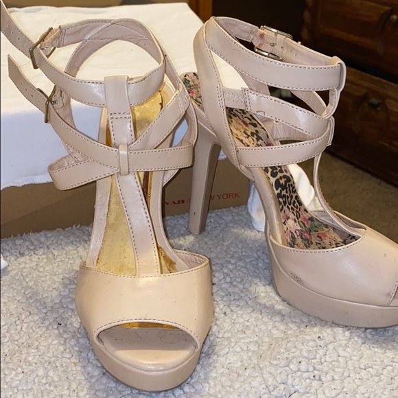 Cream/tan open toed heels. 5” heel. Right shoe is missing the decorative pad. Slightly scuffed