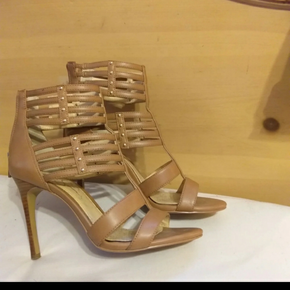 Beige and gold rhinestone heels