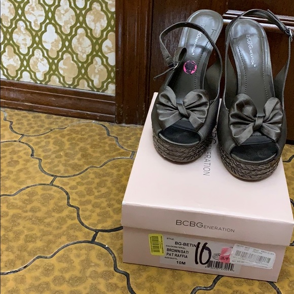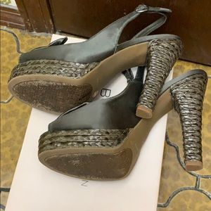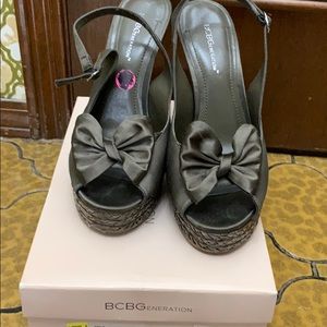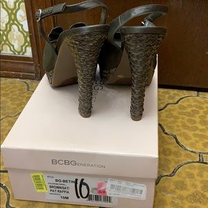 BCBG brown /Sat/Pat Raffia size 10m Smoke free/pet free home 4inch heel Gently worn . Army green