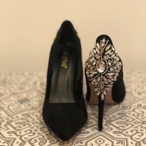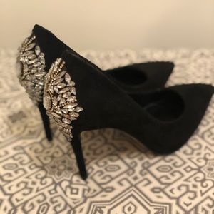 Black Suede Beaded Badgley Mishka Replica Heels! Beautiful silver beading on the back of the heels! Never worn, brand new! In a Size 40.