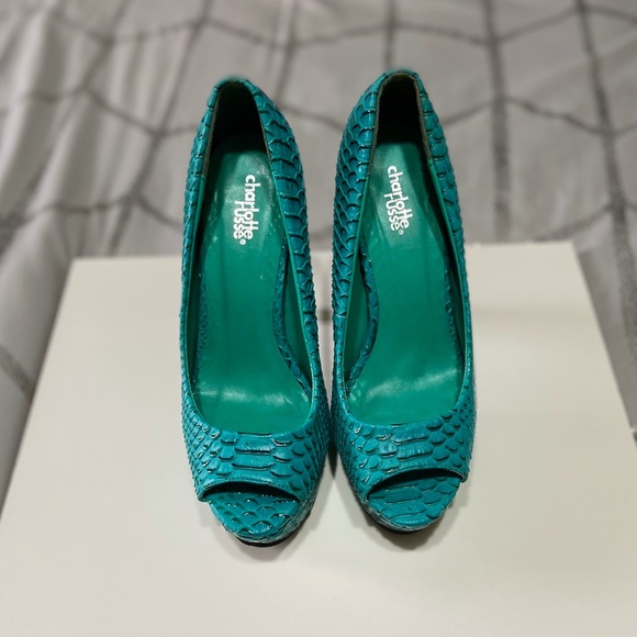 Aqua teal Platform heels with a raised snakeskin design. Good condition! Received many compliments on these beauty’s.