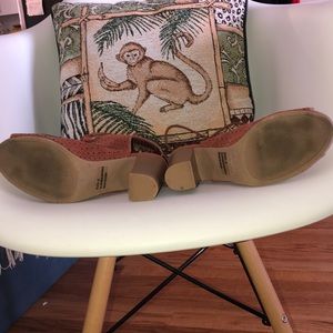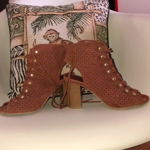 Open-toed lace up 3 inch heels. Has gold plated buttons Color: Burnt orange