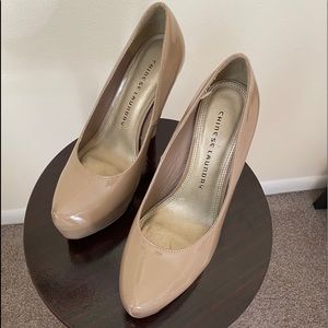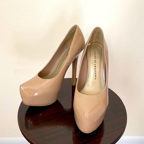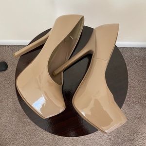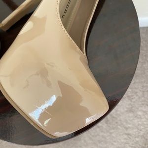 Platform heels. Patent leather. Worn once, in excellent condition. There are two tiny flaws that aren’t very noticeable. See pics.
