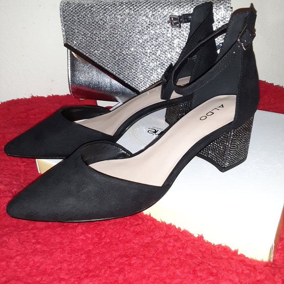 Black shoes with straps that go around the ankle and the heels are glittery. Never been worn