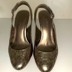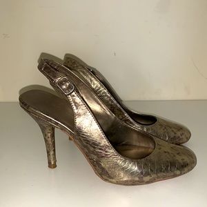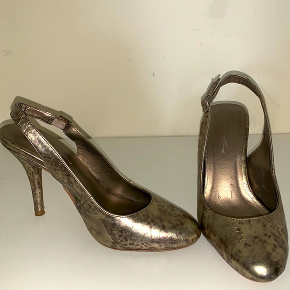 Size 5.5! This chromed snake skin shoe will provide comfort as well as style! Very vintage feel with these beauties