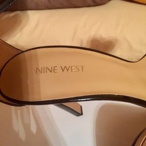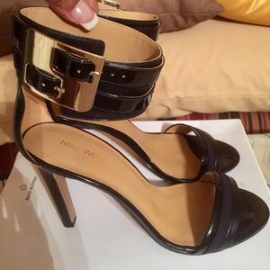 Ladies NINE WEST black smooth leather heeled sandal…size 9 medium…4 inch heel…ankle strap with goldtone hardware and double buckle closure..worn once.