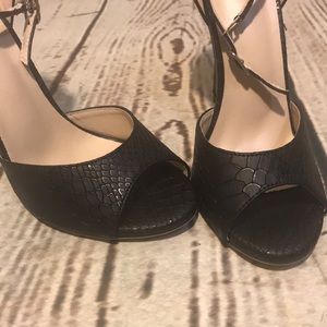Black Faux Snake Skin Stilettos! Peep Toe/4” Heel Buckle at Ankle No Branding Like New!