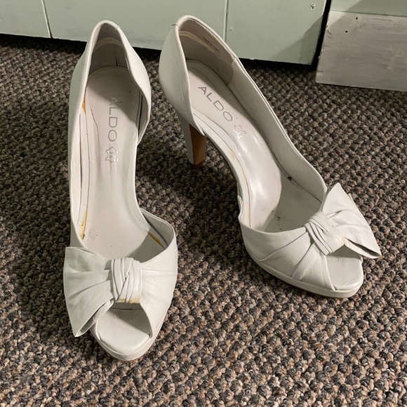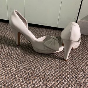 White open toe heels with bow in front. Very comfortable low heel