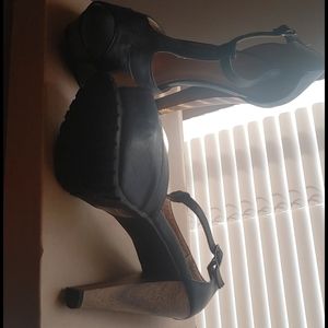 Never worn black leather rugged bottom front strap open toe with side closer & gorgeous natural wood look high heel