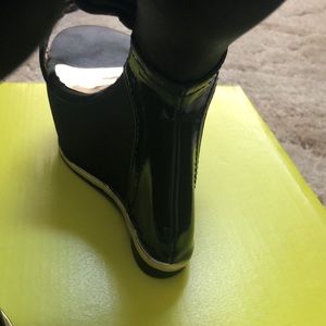 Very cute pair of heels but without actual heel! Black with gold trim on the bottom. Zipper on the back. Only worn once with a black cocktail dress! Got a lot of complements that night!