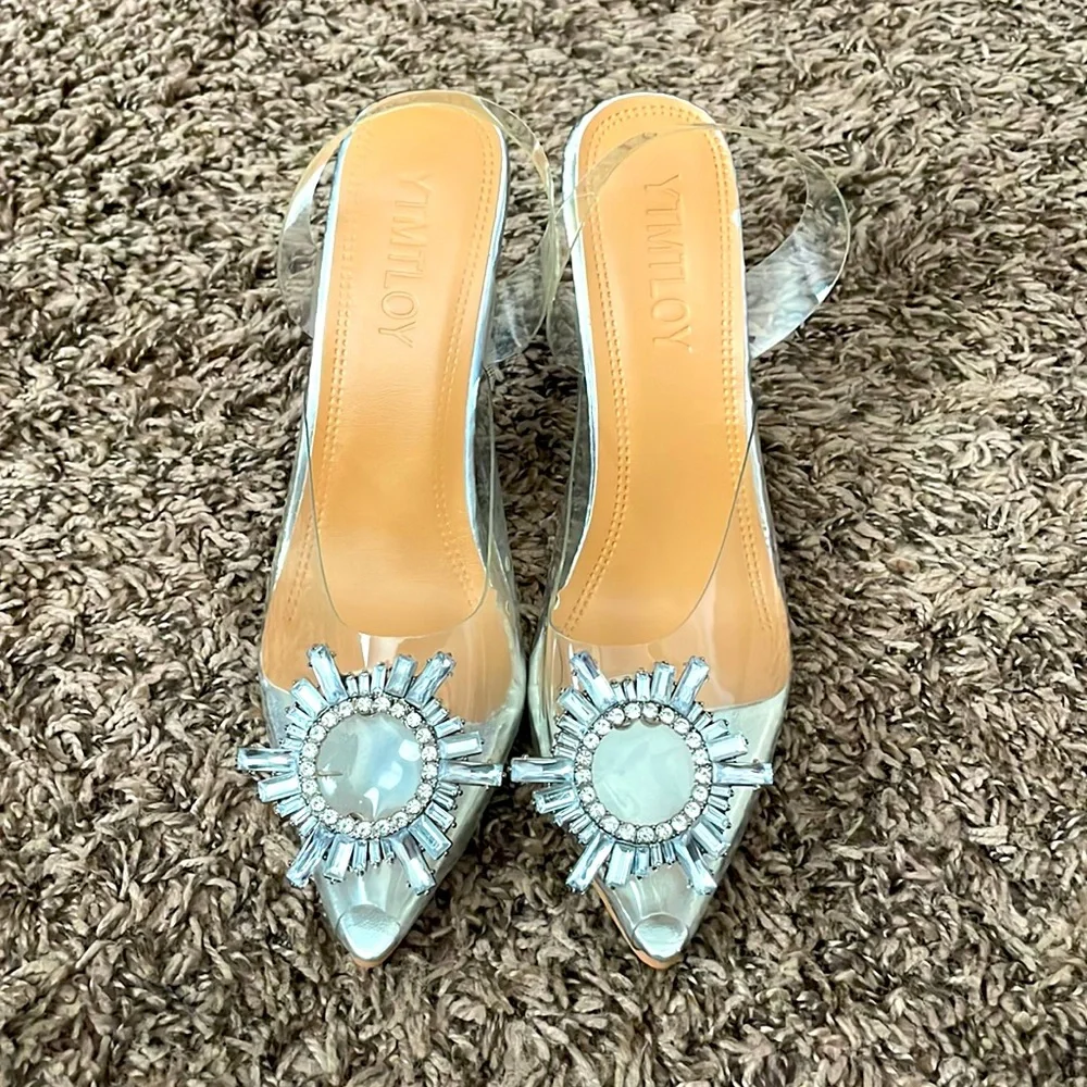 Clear heels with round diamond decor on front. They have a strap. Never worn