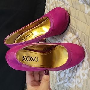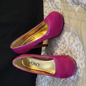 Fuchsia colored suede heels, slight damage on one, shown in picture.