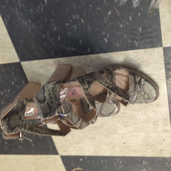 artificial snakeskin heels.31/3 inch heels.buckle strap.zipper design on back of heel.