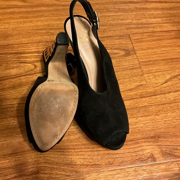 Vince Camuto Size 8 B Black velvet heels with gold embellishment.